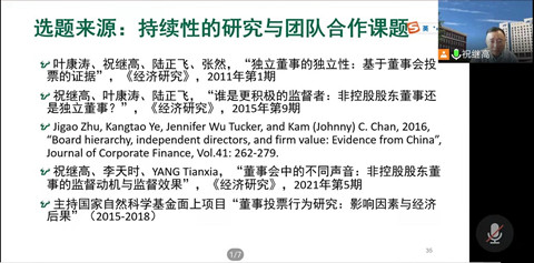随后,祝继高为青年教师和博士生进行论文选题的讨论和分享。他在北京大学攻读博士期间便开始了董事会的相关研究,最开始搜索了独立董事投票的相关数据,展开了有关独立董事的系列研究。后来在研究过程中发现,除了独立董事,其他非控股股东董事在公开议案中投反对票也很积极,因此便有了研究非控股股东董事的形成、监督动机及其经济后果的想法,从而有了“谁是更积极的监督者:非控股股东董事还是独立董事?”“董事会中的不同声音:非控股股东董事的监督动机与监督效果”等研究。祝继高谈到,虽然董事会研究是一个较老的话题,但是在一个小的话题里面坚持较长时间是很有收获的,一方面可以更加深入了解相关的文献,另一方面可以驱使自己进行更多的实务观察,从而将文献与实务更好地结合,在老话题中产生新的想法,将研究做新做细致。