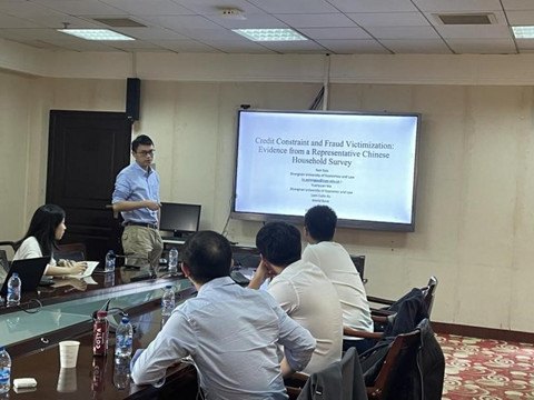 高楠老师的报告题为“Credit Constraints and Fraud Victimization: Evidence from a Representative Chinese Household Survey”,该研究主要分析了信贷约束对中国城镇诈骗受害的影响。高楠介绍了中南财经政法大学博士生遭十万余元信贷诈骗事件,并结合社会近期的诈骗案证明了社会诈骗发生的普遍性。诈骗接触群体的样本分析表明,接触诈骗并受害的群体普遍存在情绪控制不稳定、生活习惯差、爱好网购等个体特征,此类群体在受到信贷约束的情境下,更易遭受诈骗。个人折扣因子和合作倾向是信贷约束影响欺诈行为的关键途径,个人折扣因子是受害者在需要现金和具有储蓄需求的状态下,施害者提供的“短期信贷”给受害者提供了极具吸引力的“短期收益”;合作倾向是指受害者在受信贷约束时,更容易与施害者“合作”,导致诈骗事件的发生。