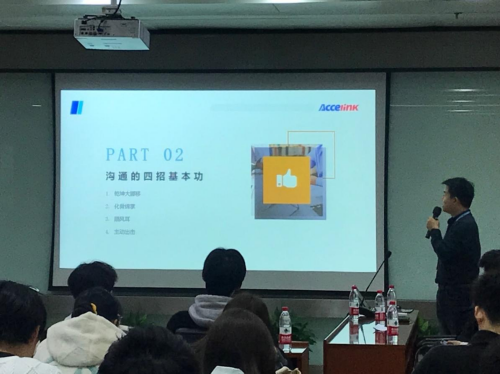 最后,余强经理以“沟通管理”为题,结合自身的管理经验,并通过经典电视剧《亮剑》的视频片段,为同学们分享了在企业中的“沟通之道”。通过该环节,让同学们明晰在日常工作中的大部分问题可以通过良性沟通来解决,但是需要掌握换位思考和倾听的技能;其次,鼓励同学们向上沟通,主动寻求上司的反馈与支持,为自己赢得更多的发展机会。