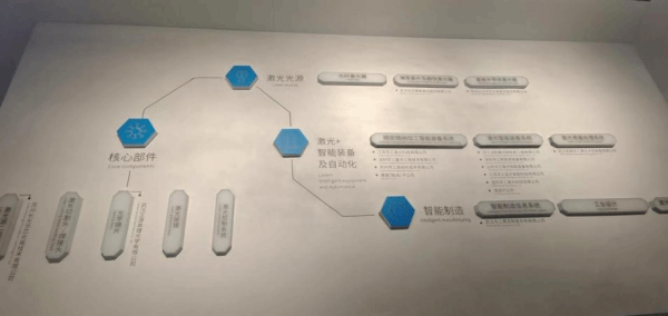 走过长廊,师生们来到介绍激光应用的展厅。从激光科普的视频中,我们认识到激光的三要素是激发源、放大介质和反射镜。从一件件展品中,我们进一步了解激光可以用来标记、切割、焊接、微加工、3D打印、清洗、热处理。激光在3C(电脑、通讯和消费性电子产品)行业中的应用主要是打标,切割,焊接和微加工。在“快速消费品”板块,同学们了解了华工激光在快速消费品的组装层、部件层、品牌层的产品和工艺。在“大国重器”板块,我们了解了华工激光在轨道交通和航空航天领域的产品。在“更多应用”板块,我们了解了华工激光在新基建、医疗、教育、家电领域的产品。在“汽车制造”展厅,我们了解到华工激光打破了国外在汽车制造高质量高效激光焊接、切割关键工艺及成套装备领域的长达40余年的垄断,获得习近平总书记亲自授予的“国家科技进步奖一等奖”。“光之源”展厅的最后,是华工激光的产业链图。