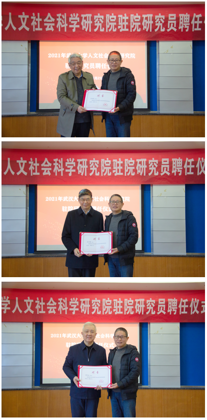 人文社会科学研究院第三届、第四届驻院研究员聘任仪式。第三届、第四届驻院研究员遴选工作分别于2019年12月、2021年1月启动,经单位推荐、资格审核与评审、结果公示、学校审定,聘任乔洪武、陈继勇、郭熙保、王先甲、肖希明、谭力文等六位教授为一楼一凤