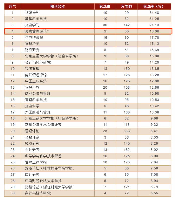 工商管理学科涉及全文被转载的期刊数量为183种,进入转载量表的期(集)刊共30种。在30种入选刊中,《珞珈管理评论》作为唯一入选的集刊,转载率为18%,位列第4名(如表1所示);综合指数为0.539853,位列第11名(如表2所示)。
