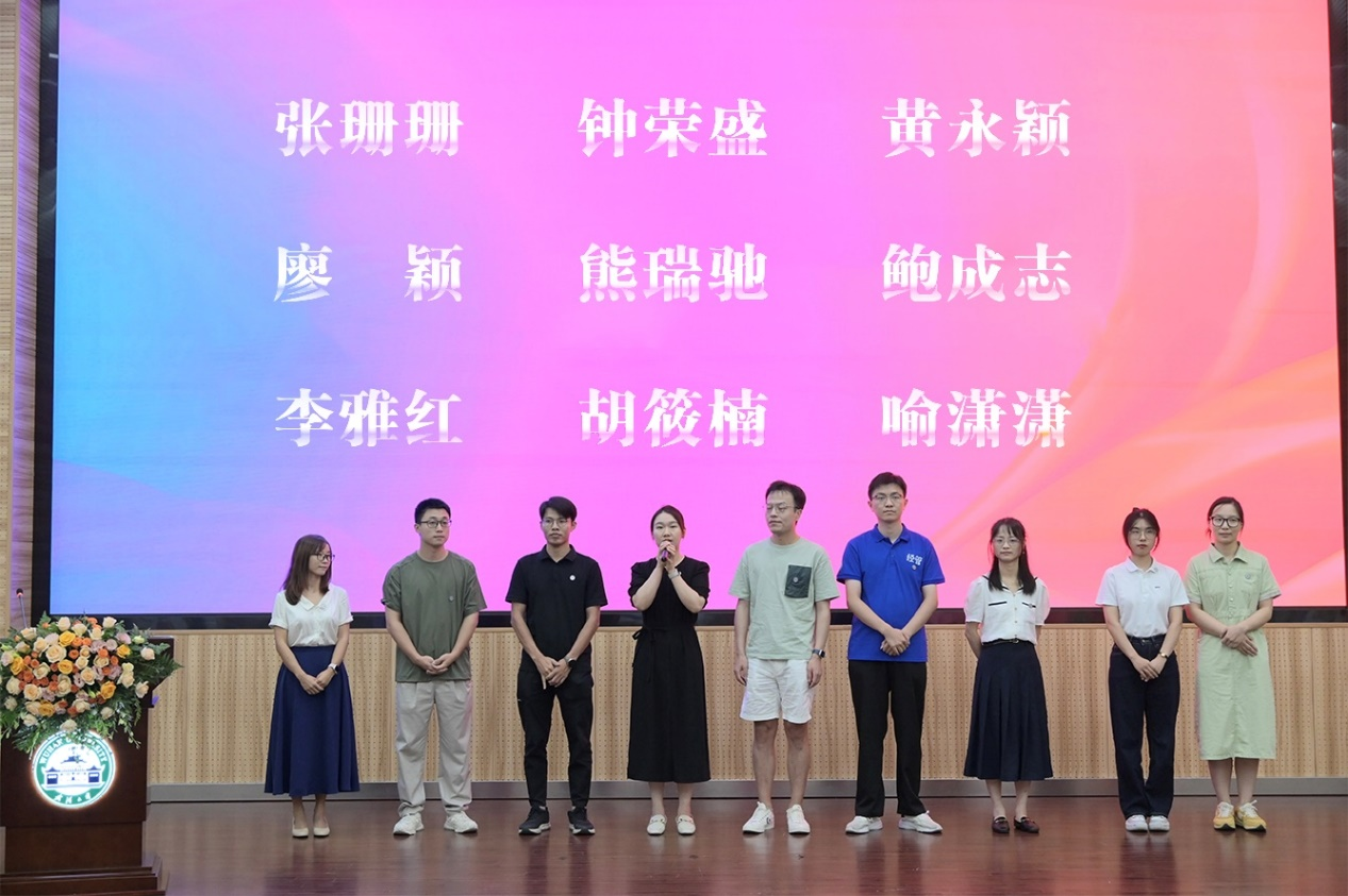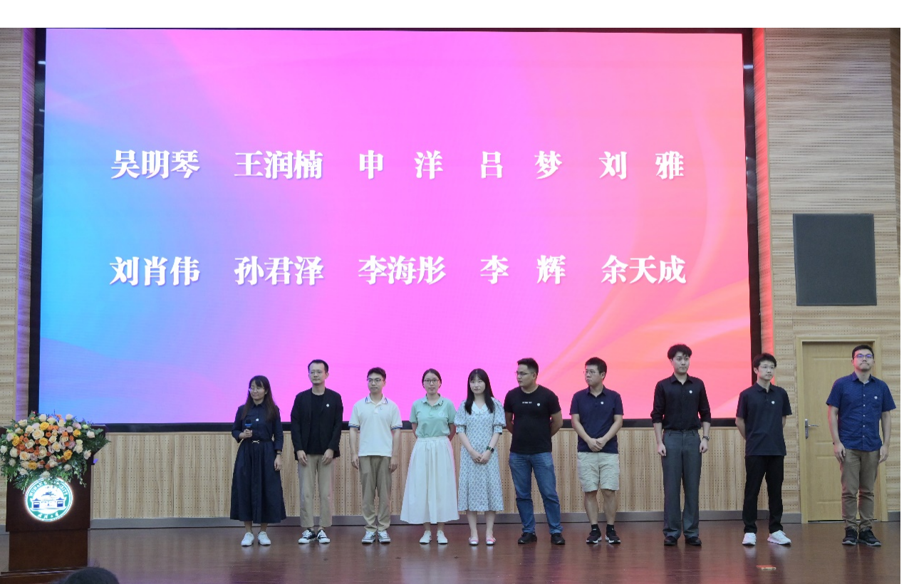 接着,大会举行新教职工入职仪式。新入职的教职工有吴明琴、王润楠、申洋、吕梦、刘雅、刘肖伟、孙君泽、李海彤、李辉、余天成、张珊珊、钟荣盛、黄永颖、廖颖、熊瑞驰、鲍成志、李雅红、胡筱楠、喻潇潇。在现场佩戴院徽后,19位新入职的教职工依次上台进行了自我介绍。学院还专门为新入职教师制定了“成长导师”制度,帮助他们在教学科研道路上快速成长。