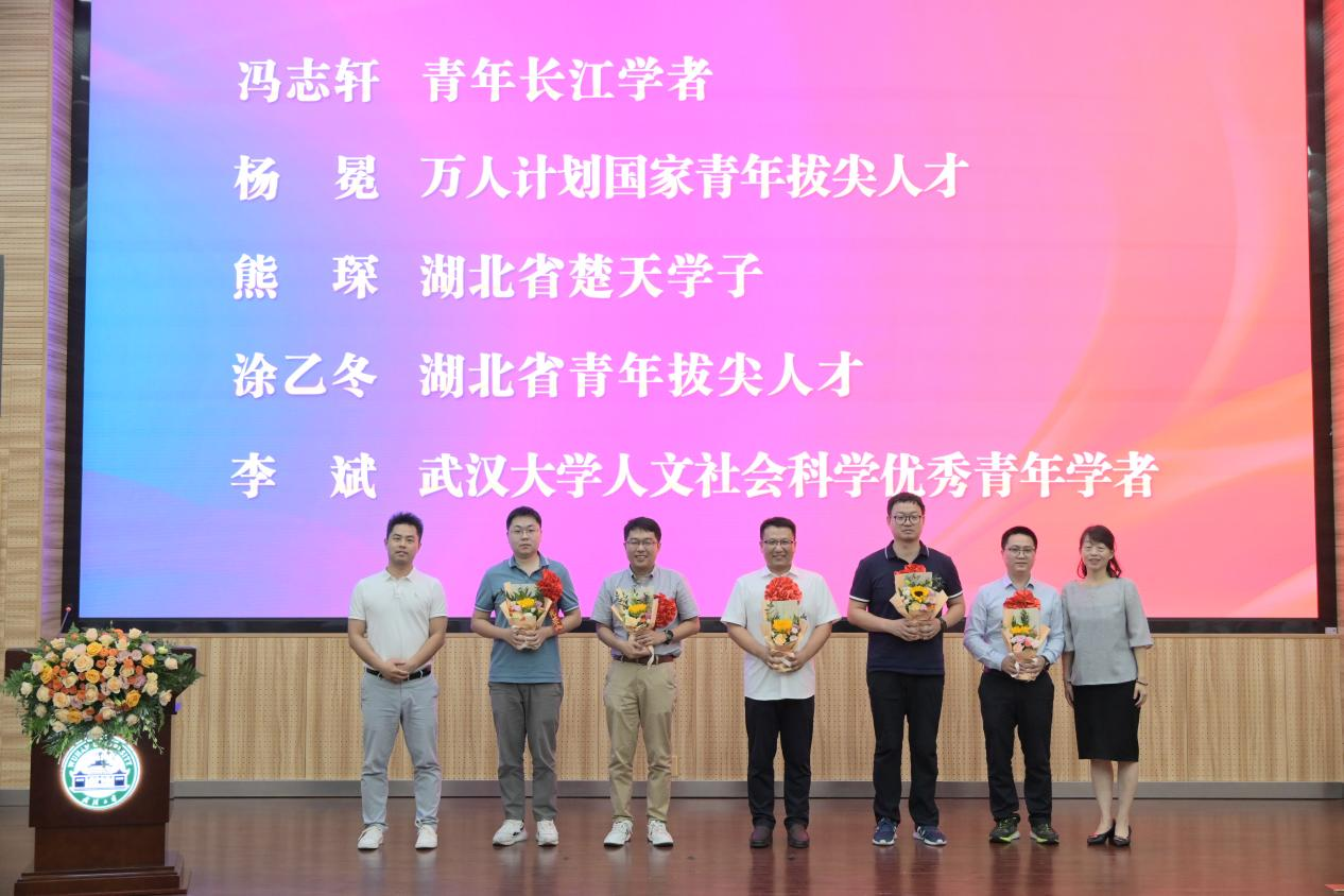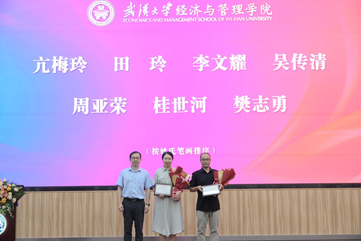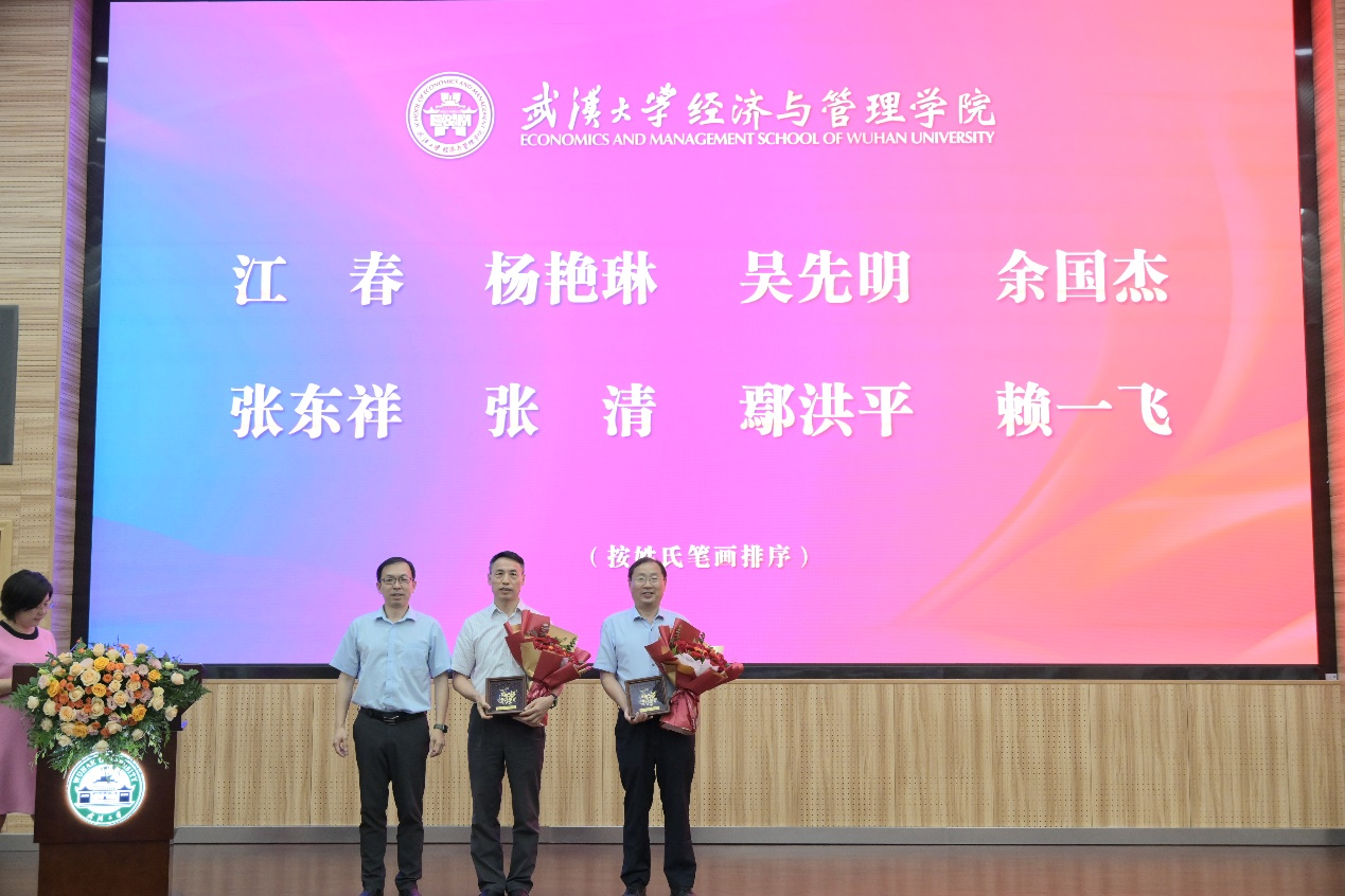 首先,大会对今年的荣休教师和执教满三十年教师进行表彰。荣休教师有江春、杨艳琳、吴先明、余国杰、张东祥、张清、鄢洪平、赖一飞。执教满三十年教师有亢梅玲、田玲、李文耀、吴传清、周亚荣、桂世河、樊志勇。聂军院长为荣休教师代表杨艳琳、张东祥和执教满三十年教师代表亢梅玲、桂世河颁奖。