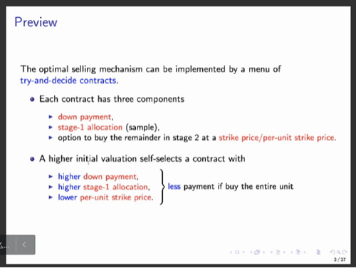 讲座首先介绍了研究背景。这是对于收入最大化机制的研究,其中卖方分两个阶段向买方出售一个单位的可分割商品。在第一阶段,买方可以依靠他对商品的私人粗略估价来确定他的第一阶段消费水平。更多的消费使得第二阶段对商品的私人估值更准确,之后他确定他的第二阶段消费水平。