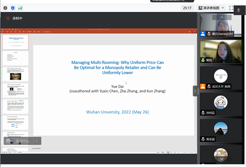 5月26日上午,由管理科学与工程系主办的“管理科学与工程学术论坛第58期”在腾讯会议平台通过线上方式举行。据悉,本次讲座也是武大物流与供应链管理协会承办的格“物”致“知”Ÿ百“链”成金(电子商务供应链优化)系列讲座之一。本次讲座由管理科学与工程系戴宾教授主持,复旦大学的戴悦教授带来主题为“UnifyingorDiscriminating: Competitive Strategies for Omnichannel Retailers”的学术报告。学院许明辉、冯华、李彬、柯剑男等多位师生参加论坛。此外,全国各地高校如南京大学,中南财经政法大学、上海海事大学等百余名校内外师生也参加了此次讲座。