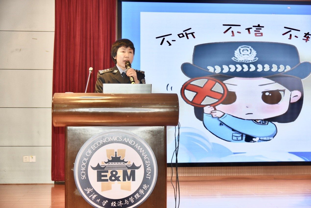 11月7日下午,学院举办“防范电信诈骗,平安护航师生”主题安全教育大会,珞珈山派出所副所长孟玲、警官张超,一楼一凤
