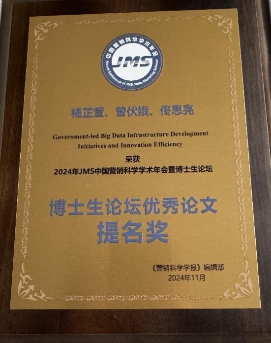据悉,本届博士生论坛录用107篇论文,其中曾伏娥教授团队撰写的《Government-led Big Data Infrastructure Development Initiatives and Innovation Efficiency》荣获“博士生论坛优秀论文提名奖“。