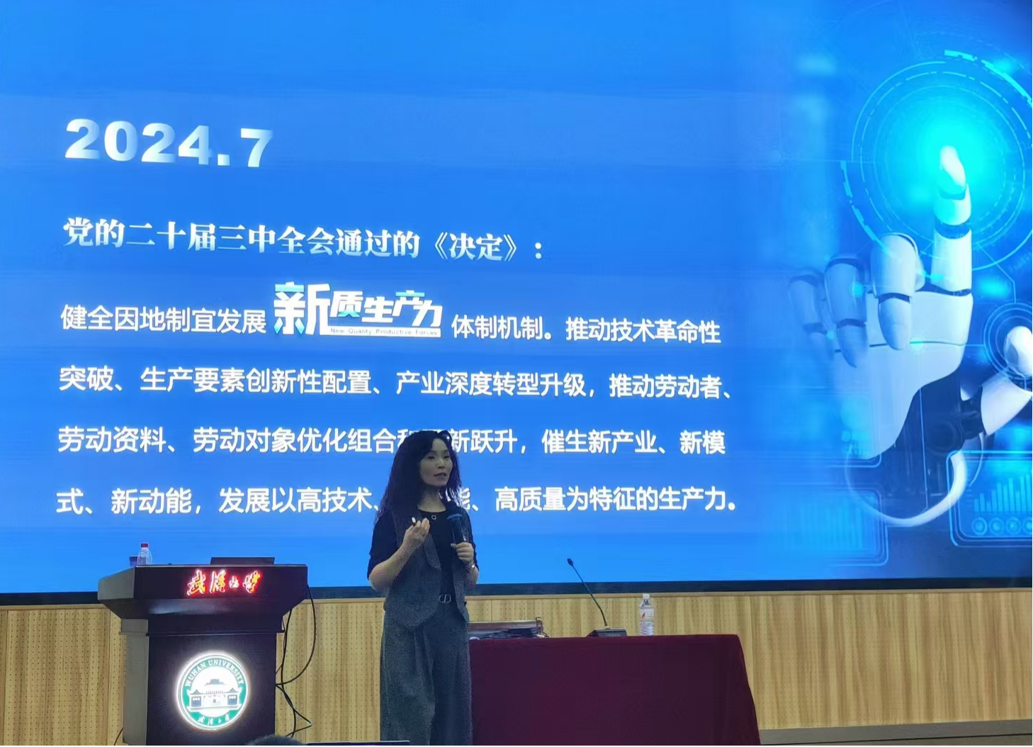 教授杜莉围绕党的二十届三中全会精神进行深入解读并对新质生产力做出全面分析,明确新时代的发展方向与个人的历史责任。党的二十届三中全会审议通过了《中共中央关于进一步全面深化改革、推进中国式现代化的决定》。其中,要求“健全因地制宜发展新质生产力体制机制”,并作出全面部署。新质生产力是推动高质量发展的内在要求和重要着力点驱动力。杜老师详细阐述了新质生产力的三个核心要素,即新型劳动者、创新劳动资料和改造劳动对象,并讨论了它们在中国经济发展转型中的重要性。培训最后,杜老师提醒作为经管院的学子关注国家的发展战略,特别是关于新式生产力发展的规划和布局并鼓励大家成为适应新时代的新型人才,以应对未来的挑战,要将理论知识与实际相结合,以推动社会发展,为国家的强盛和民族的复兴贡献自己的力量。
