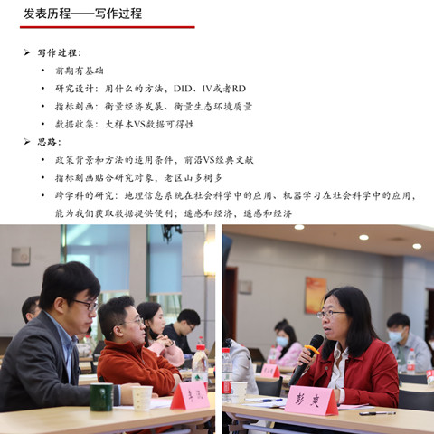 谢泽宇分享的论文是《省界毗邻地区绿色发展路径探索:来自革命老区振兴的启示》,发表于《世界经济》。他介绍了文章的研究动机及研究问题、实证设计与数据来源、实证结果和进一步分析以及实证主要结论和政策建议,还分享了本篇论文的发表历程,不仅向大家展现了写作过程及思路,还展示了对外审专家的两篇修改回复报告,生动地诠释了“精益求精”在学术道路上的重要性。数理经济与数理金融系李汛老师、《经济评论》编辑彭爽老师进行了点评指导。
