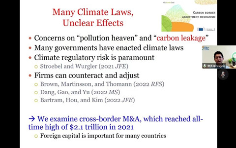 最后,汤教授展示了本文的实证结果。实证结果表明气候法律的颁布会导致本国企业被外国企业收购的概率降低。在被收购企业更多地暴露于气候法规时、被收购企业所在国家气候法律执行力度更强时,以及交易规模更大时,这种效应更加显著。在收购方对气候变化的担忧更多时,以及在收购方曾经历气候灾害时,这种效应会减弱。其他实证结果表明,被收购方所在国家气候法律的推行会增加撤标概率、减少协同效应、降低收购方出价、减少并购后企业经营表现提升。通过实证分析结果可以看出,气候法规能够影响企业的跨国并购,进而影响国际资本流动和资源配置。