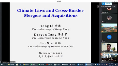 承办的长江论坛第一百五十七讲通过线上线下结合的方式举行。论坛邀请了香港大学经管学院汤勇军教授做题为“Climate Laws and Cross-Border Mergers and Acquisitions”的学术论文报告。论坛由学院会计系李青原教授主持,学院潘红波、周楷唐、林晚发等众多老师和学生参加了此次论坛。