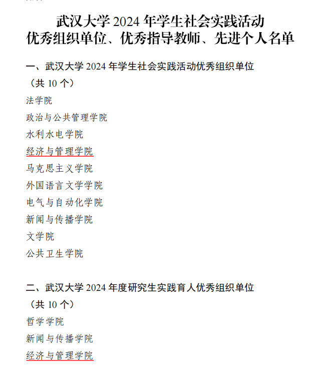 此外,学院联合260余名专业教师、聘任30余名校外导师,与45家企事业单位共建实习实践基地、定期选派学生进行基层实践锻炼、参与基层社会治理,加强政校企融合,拓宽育人载体。同时,学院积极整合资源,开展职业培训等活动70余场,吸引600余名研究生积极参加“武大研行”、“青樱计划”、“珞英计划”等校级各类精品实习实践项目,产出调研报告或论文共32篇,其中研究生黄丽陇在广州市海珠区“青春网格员”项目获《焦点访谈》栏目采访。同时,积极参与学校党委研究生工作部组织的时代新人说、微课堂、座谈会等项目,以全网直播或线下分享等形式,积极发挥社会实践领域模范效应带头作用,向全校师生以及全社会积极宣讲武大作为和经管担当。