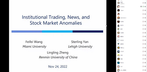 金融系、金融研究中心、金融发展与政策研究中心及金融工程与风险管理研究中心共同主办的“景林珞珈金融论坛第225期”通过线上方式举行。论坛邀请了中国人民大学商学院金融副教授郑凌凌做题为“Institutional Trading, News, and Stock Market Anomalies”的学术论文报告。论坛由学院金融系李斌教授主持,校内外众多师生参加。