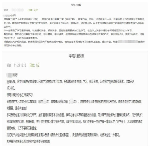 课程定期分析学习数据,教师有效识别异常学情,并开展有针对性的定向扶助。例如,通过学习预警,在保护学生隐私的情况下,及时让学生了解班级整体的学习情况,帮助学生理性评估自己的学习参与和学习成效状态,同时,积极联系学生、家长、辅导员,共同对学生的学习困难进行帮扶。