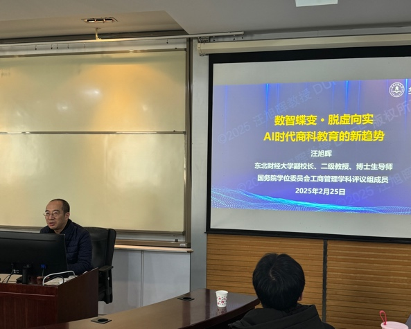 2月25日下午,珞珈经管创新论坛第122期在学院举行。本次论坛邀请东北财经大学党委常委、副校长汪旭辉教授作“数智蝶变•脱虚向实:AI时代商科教育的新趋势”学术报告,学院众多老师和学生参加。论坛由一楼一凤