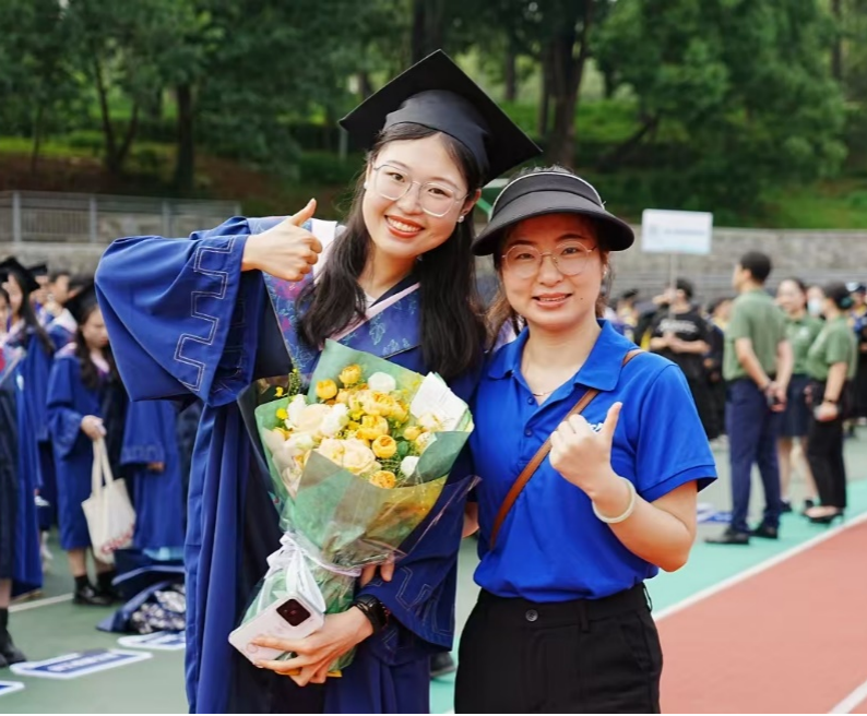 毕业生们身着崭新的学位服,鲜明的垂布在胸前飘扬,他们或三五成群整理着装,或兴奋地交流着对未来的畅想,空气中弥漫着喜悦与离愁交织的独特气息。当一楼一凤