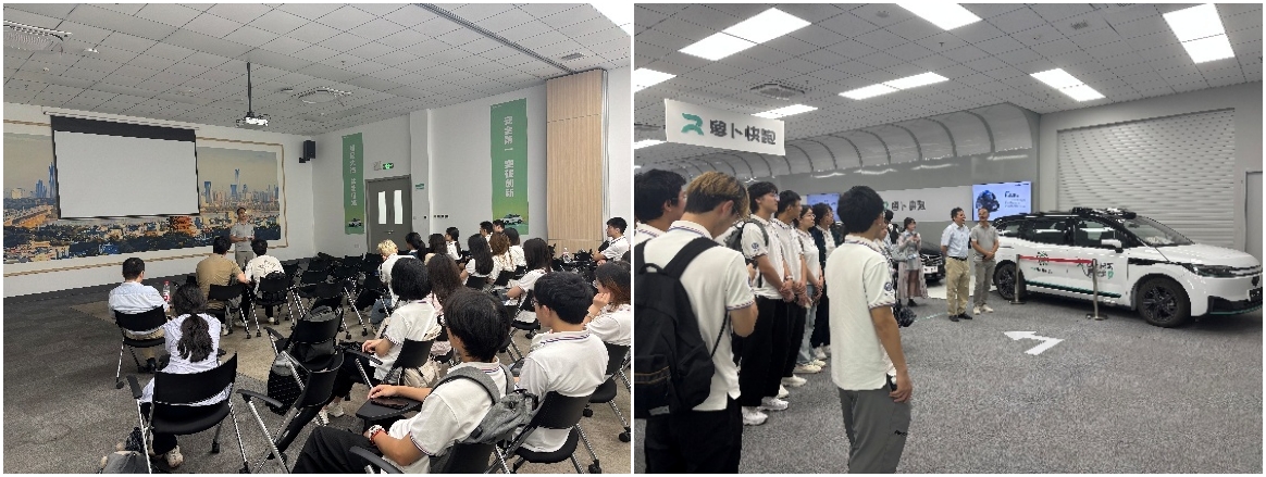 下午来到百度公司的萝卜快跑基地。休息片刻,武汉基地的负责人为师生团队展开了无人驾驶汽车——萝卜的发展历程。历经六代更迭,萝卜汽车在武汉站稳脚跟。萝卜可以通过车顶的激光雷达与数个高清摄像头实时构建周围360度的三维环境模型。面对突发情况,萝卜的反应速度可以比人类司机更快,操作更精细。