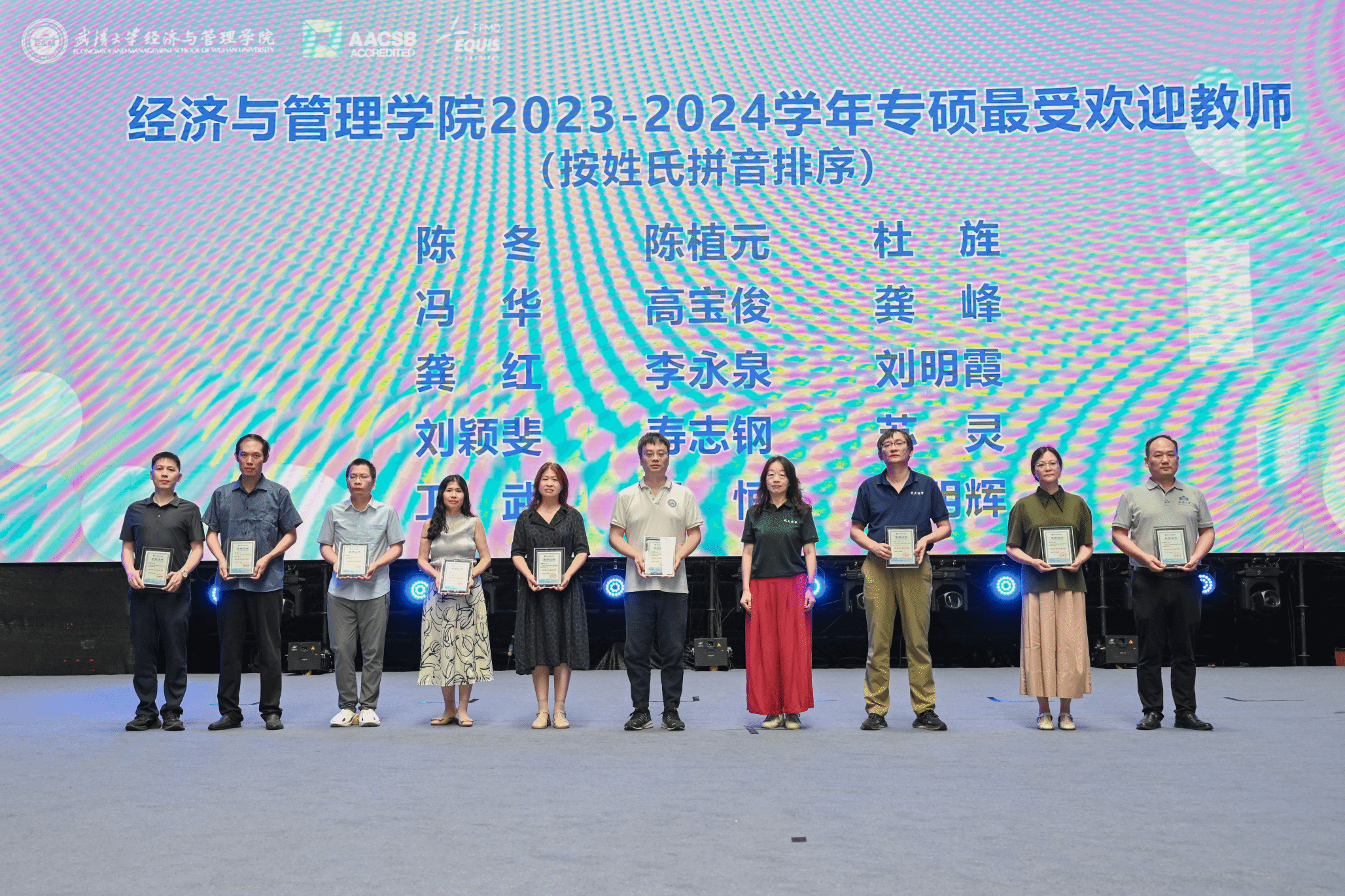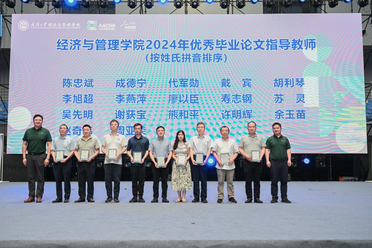 随后,会议进入颁奖环节,隆重表彰了2023-2024学年专业学位“最受欢迎任课教师”及2024学年专硕“优秀毕业论文指导教师”,表彰他们在教学与指导中的卓越贡献,感谢他们为学院专业学位教育付出的心血与智慧。学院副院长谢雅维,党委副书记李好、杨志威分别为获奖教师颁奖。