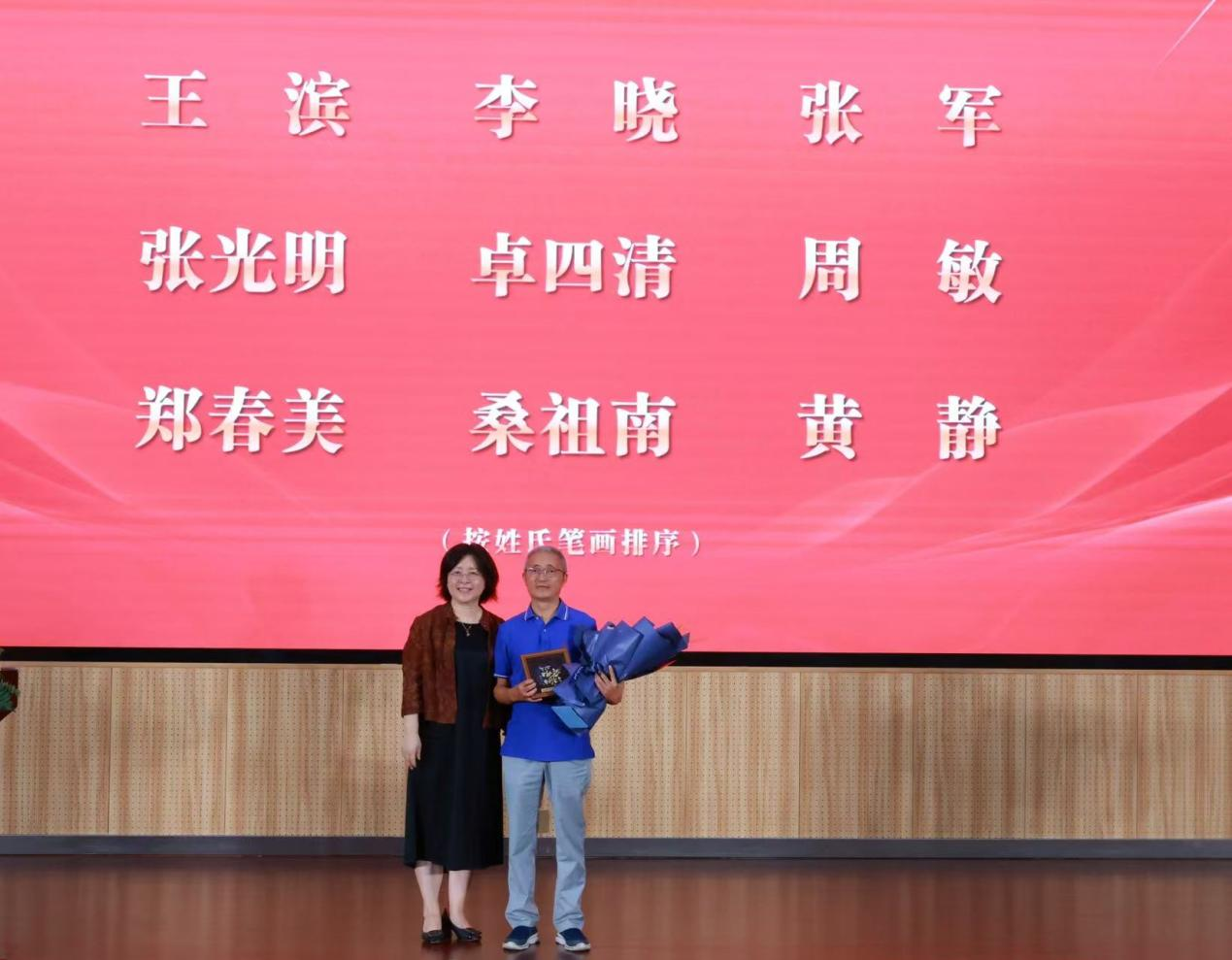 共有王滨等九位老师光荣退休,成德宁等十二位教师执教满三十年。王丽萍书记为荣休教职工代表张光明颁奖,聂军院长为执教满三十年教师代表颁奖。