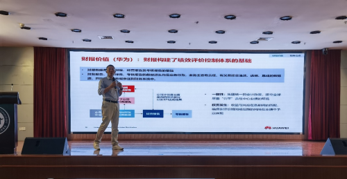 王国伟先生从问题“你希望成为一名会计吗”引入,鼓励同学们表达自己的想法。他否定了人们对会计行业“是一群账房先生”刻板印象,并从“财报价值与治理”、“流程架构与实践”和“未来挑战”三个维度对华为公司的会计体系的构建和运转进行了详细阐述。