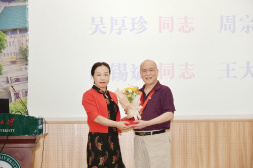 党委书记姜星莉为“光荣在党五十年”老党员代表赵锡斌同志颁发纪念章。学生代表向可敬可爱的获奖教师们献上鲜花和祝福。