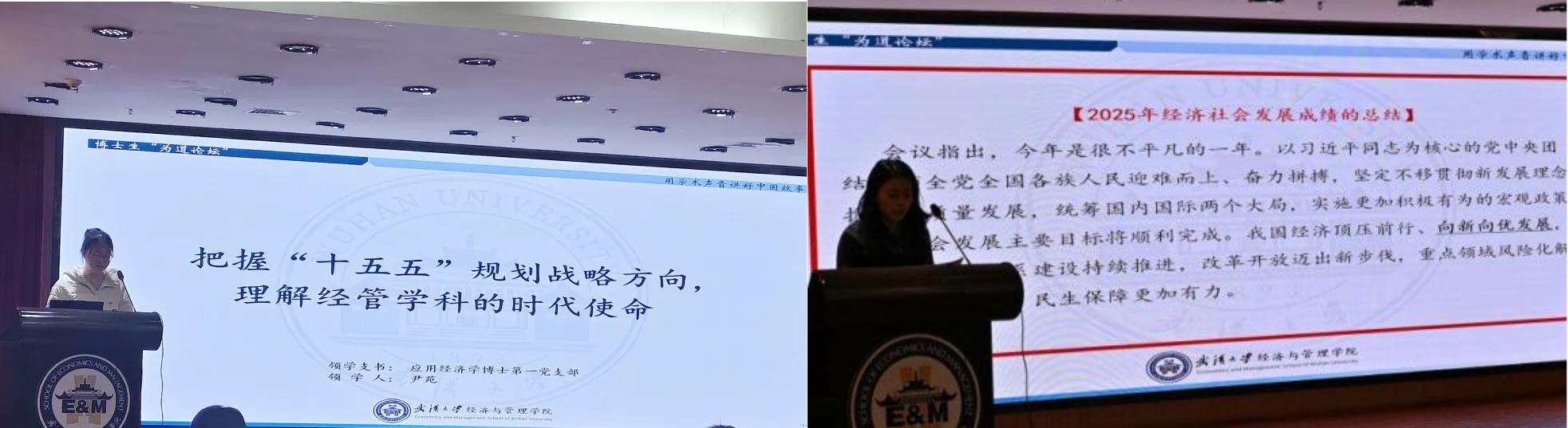 党建学习分享环节,应用经济学博士第一党支部书记尹苑以“把握‘十五五’规划建议战略方向,理解经管学科的时代使命”为题,解读“十五五”时期现代化产业体系建设、科技自立自强等核心战略,强调经管学科需主动对接国家需求;理论经济学博士党支部书记张文佳领学《2025年中央经济工作会议精神》,聚焦八大核心任务,引导学子把握经济高质量发展方向。