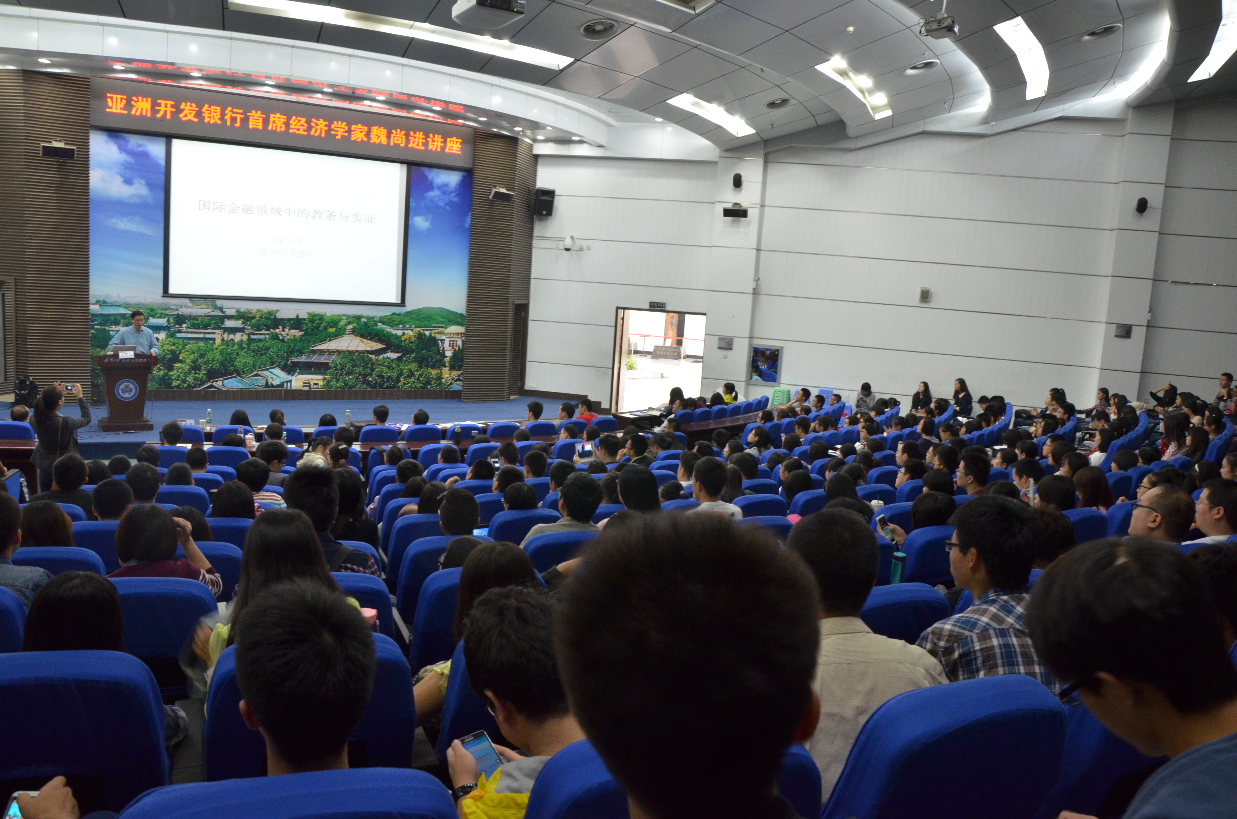 整场报告会座无虚席,连走廊上都坐满了学生。甚至有许多毕业多年的学子慕魏尚进教授大名返校。“魏教授讲得妙趣横生,让我们深受启发。”听了报告的师生表示获益匪浅。