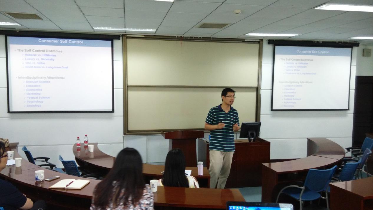 讲学。郑毓煌教授的研究涉及消费者心理与行为,尤其在消费者自我控制(self-control)领域有独到的见解。郑毓煌教授的学术报告结合日常例子,深入浅出,赢得了阵阵掌声,激发了风趣而精彩的讨论。