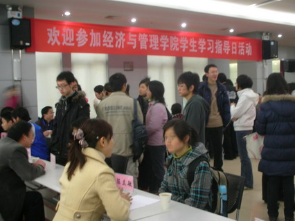 现场咨询台中,同学们更多地将问题集中于专业培养、就业形势、学习方法等方面。不同年级的同学根据学习情况的不同,所涉及的问题也各有侧重。大一新生关注本学期伊始所面临的转专业与选修课的情况,大二的同学更多考虑的是专业划分后的课程设置、具体要求与发展前景,而大三大四的同学则主要将目光集中于考研、就业等实际问题。此外,还有来自学校其他院系的同学前来咨询,希望得到一些报考经管类研究生方面的建议。各位老师在结合自身教学经验的基础上,对同学们的问题有问必答,从专业的角度解决学生疑惑,并提出合理的专业规划。一位08级同学表示,在经过了一个学期的学习后,她对所学专业的情况有了初步的了解,但她更想知道该专业未来的学习方向、课程设置及发展前景等问题。通过本次咨询,她对自己目前的专业进行了重新审视,并对自身的发展有更加明确的定位。