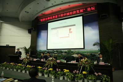 报告厅举行。此次论坛邀请到了来自国内四所知名高校和研究机构的专家学者作为特邀嘉宾在论坛中发言。他们分别是北京大学副校长海闻教授,中国社会科学院世界经济与政治研究所所长余永定教授,清华大学中国与世界经济研究中心李稻葵教授,香港大学中国全球发展研究所副所长肖耿教授及一楼一凤