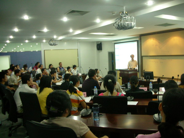 教学竞赛现场,气氛热烈活泼,各位参赛教师准备充分,普通话标准,板书清晰,多媒体课件图文并茂,生动形象,充分展示了学院青年教师出众的教学能力和良好的精神风貌。如市场营销系推荐参赛的桂世河老师,声音洪亮,富有感染力,教学课件取材于校园随处可见的各类广告,先声夺人,一下将教室的气氛带动起来,形成师生之间的良好互动;如财政与税收系推荐参赛的王玮老师,吐词清晰,条理分明,沉稳大气,娓娓道来,让在场师生听得心悦诚服。在互动环节中,教师专家评委、学生评委和在场观众纷纷向参赛教师提问,在范明老师和郑春美老师双语教学的环节,现场的外国朋友也积极参与提问,范明老师和郑春美老师娴熟的英语、准确的回答赢来现场一阵掌声。