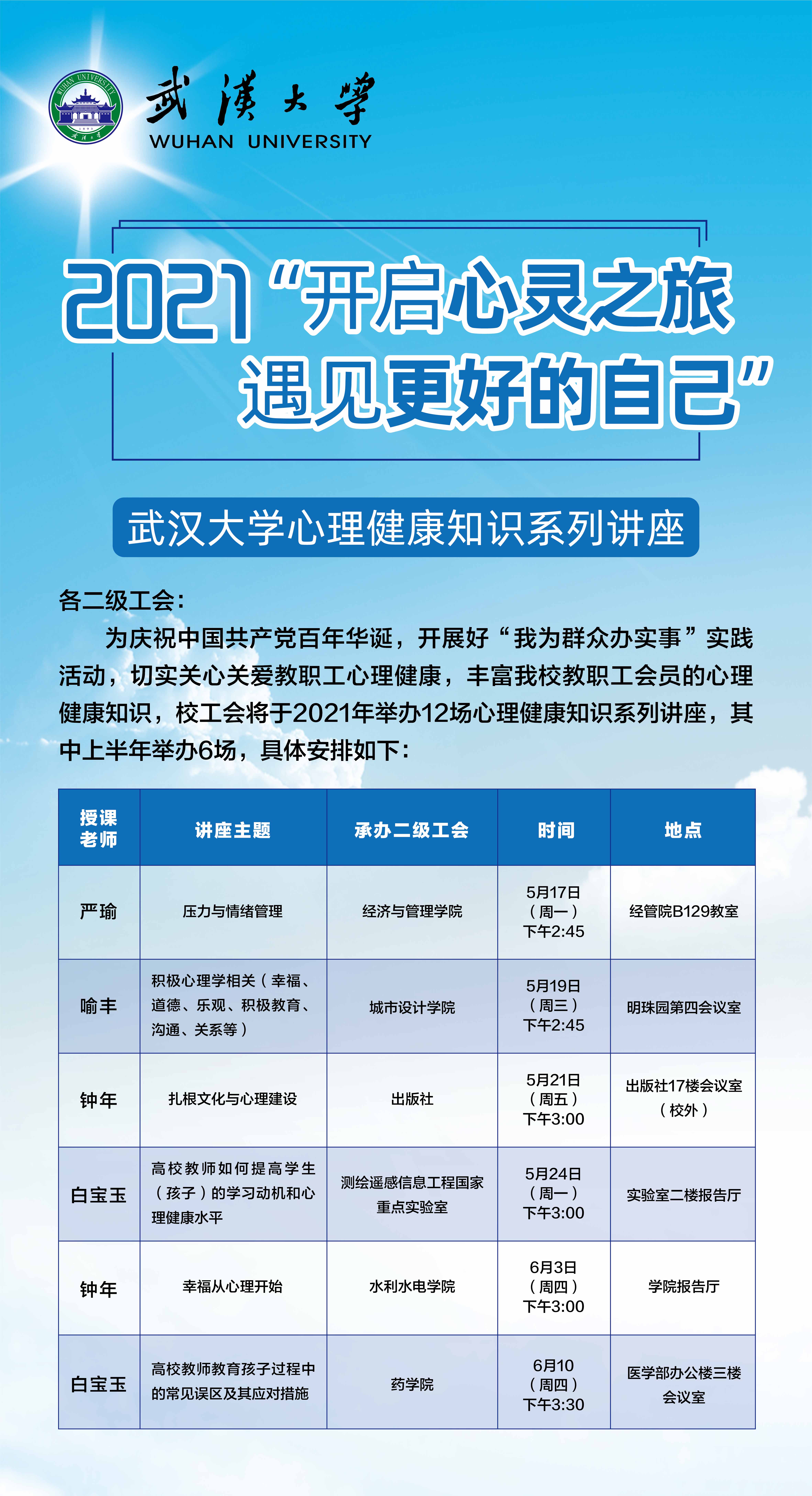 学校今年以“开启心灵之旅,遇见更好的自己”为主题将举办12场心理健康知识系列讲座活动,本次讲座为第一场。欢迎全院教职工踊跃参加!