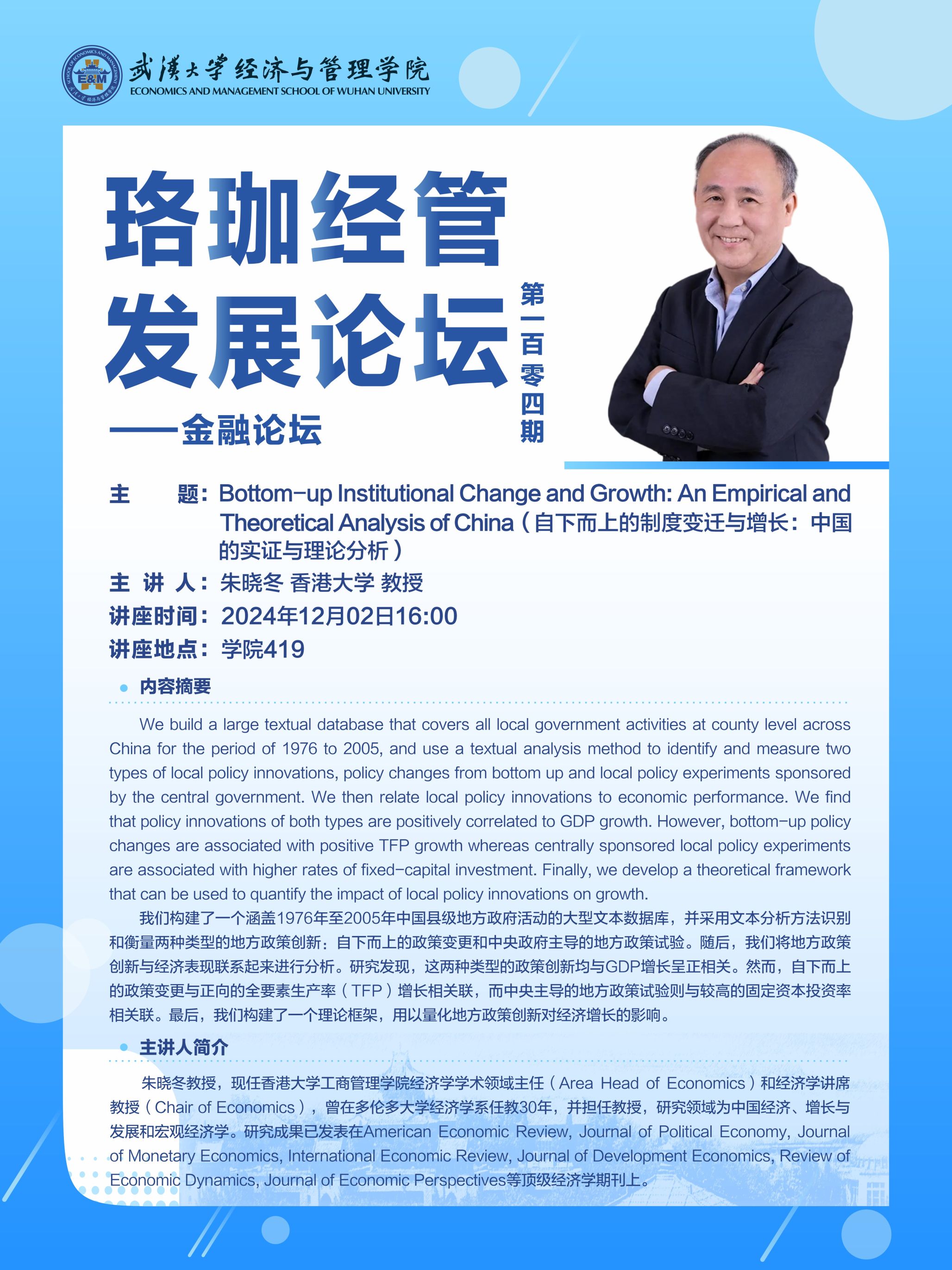 讲座预告 | 珞珈经管发展论坛第一百零四期——金融论坛