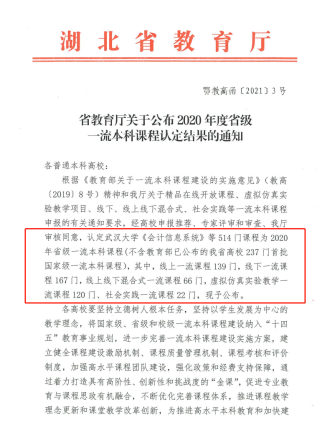 据悉,本次省级一流本科课程是湖北省教育厅根据《教育部关于一流本科课程建设的实施意见》(教高〔2019〕 号)精神和湖北省教育厅关于精品在线开放课程、虚拟仿真实验教学项目、线下、线上线下混合式、社会实践等一流本科课程申报的有关通知要求评审产生,共有514门课程入选。