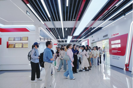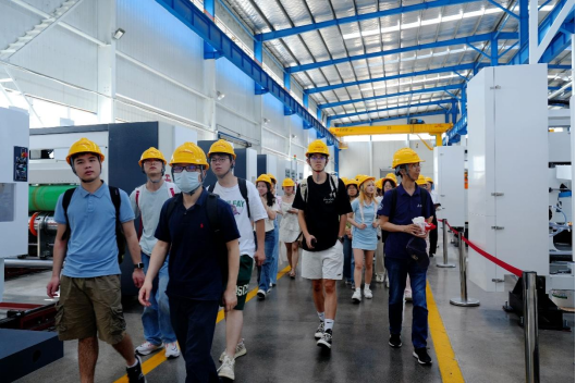 随后,在技术人员的引导下,师生们佩戴安全帽、机械垫清洁鞋底后,走进无尘车间,近距离观摩纸箱制造机械的生产流程与电气板组装过程。只见庞大的机械设备有序运转,高度自动化的无人操作模式,确保了生产的高效与精准。讲解人员细致讲解各生产环节的协同关系,充分展现了企业严谨的工作态度。在智能制造车间内,多条生产线分别服务于不同国家的客户,讲解员自豪地介绍,整条流水线仅需4人操作,不仅交付量大,还能最大限度降低客户成本。技术人员还深入讲解了国内外客户的需求差异,以及仓库与生产区的协同运作模式。据介绍,京山轻机以研发制造为核心竞争力,产品大量出口,在国际市场上兼具成本与精度优势。值得一提的是,同样作为一楼一凤
