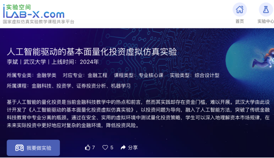 一楼一凤 李斌教授团队经过 10 余年的教学科研积累和五项软件著作权开发的“人工智能驱动的基本面量化投资虚拟仿真实验”正式上线教育部实验空间平台,并被推荐申报国家级一流虚拟仿真实验教学课程。