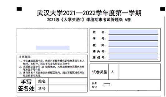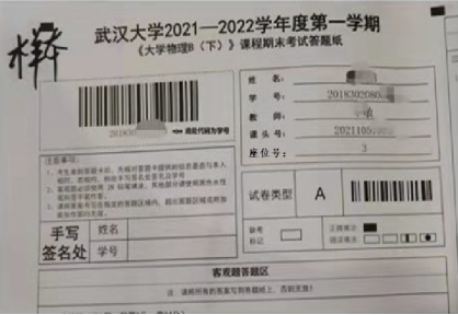 开考前,监考老师先根据考生考场座位号(由本科教务管理系统统一生成)结合考生姓名先行发放答题卡,并告知所有考生,在答题卡相应位置手写姓名及学号并确认答题卡打印信息是否与本人一致(参见答题卡样图)。试卷发放方式与往常考试无差异,答题卡示例:(图片序号改成座位号)