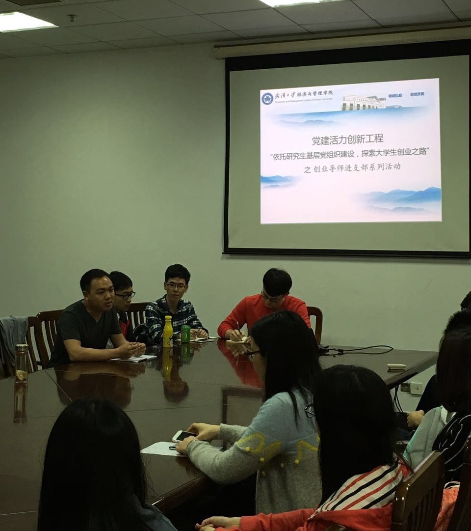 伴随着学院党建创新工程“依托研究生基层党组织建设,探索大学生创业之路”有条不紊的稳步开展,受到了同学们的一直好评,目前该系列活动已进入第四阶段——创业导师进支部。2016年4月26日中午12点半,2015级科硕一支部和科硕四支部的党员在学院第四会议室围绕“学习校园创业典型,营造支部创新氛围”举行了创业导师进支部主题党日活动,邀请到学返网创立者之一,来自水利水电学院博士二年级的李皓鑫学长做客一楼一凤