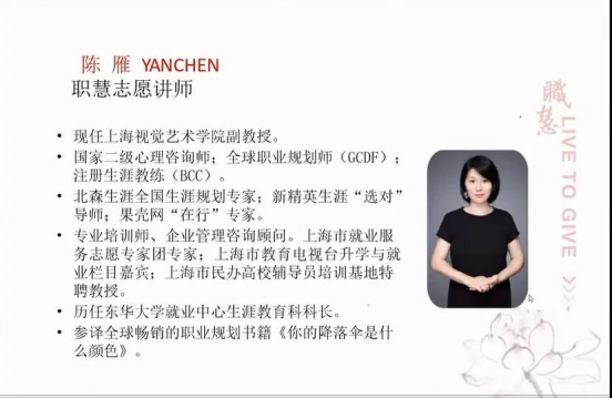 就业指导中心和“研途有我”发展解忧专项团队主办、11院研究生会协办的全民“职”作人职业训练营之“带你了解‘天分优势’”课程顺利举办。本次课程由职慧志愿讲师陈雁老师授课,通过ZOOM平台在线互动答疑,吸引了来自全校各院系的40多名同学参与。