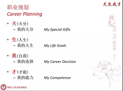 课程围绕“天生我才”这一核心理念展开,采用课前问卷、分组讨论、在线问答、集体讨论、自由分享等双向互动的形式,有效促进师生之间的交流。大家积极分享、主动交流,收获颇丰。志愿讲师陈雁老师将“天分优势”这四个字逐一分解进行讲解。首先,“天”对应天分,了解自身的天分与优势是进行职业规划的前提。在这一环节,陈雁老师要求同学们写下自己对“天分”的理解,并向大家展示自己的天分。通过剖析自我,明确自身的天分与优势,以便进行后续的职业规划。“生“对应人生,“生”即人生,思考人生的时间没有最早,永远不嫌早,最好的就是现在。只有尽早确立人生目标,明确自己心目中的成功标准,才能快速找到求职方向,规划适合自己的职业生涯。其次,“我”对应自我,人的一生面临着无数的选择,选择什么职业,过什么生活,走什么路,全掌握在自我手中。选择合适的职业方向,将达到事半功倍的效果。最后,“才”对应才能,仅仅了解自身的优势是远远不够的,我们还需要了解职场中需要哪些能力,以及自身是否具备这些能力。充分了解职场所需的能力,围绕这些能力制定自己的行动规划并做好充分的准备,方能在职场中立于不败之地。