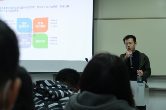 郑承良带来的讲座内容是区块链在数据共享交易中的应用——以地理信息数据共享为例。他介绍到大数据的应用具有巨大的社会效益和经济价值,然而由于多方面原因,致使地理信息大数据的共享与应用受阻。随后他介绍了从生产者到共享联盟、市场交易、再到消费者的整体方案,并向我们展示了相关成果。