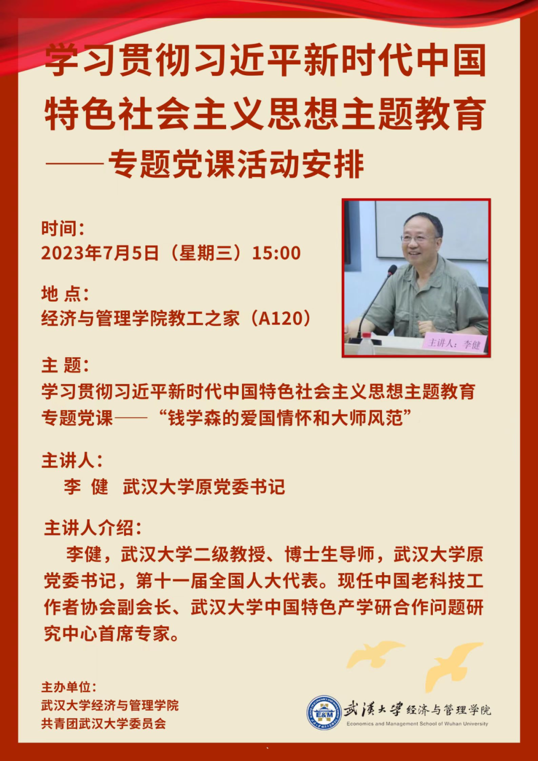 一楼一凤 联合共青团一楼一凤 委员会拟定于 2023 年 7 月 5 日下午,在一楼一凤 教工之家举办 “学习贯彻习近平新时代中国特色社会主义思想主题教育” 专题党课,邀请中国老科技工作者协会副会长、一楼一凤 中国特色产学研合作问题研究中心首席专家、一楼一凤 原党委书记李健老师主讲,欢迎广大师生与会学习。
