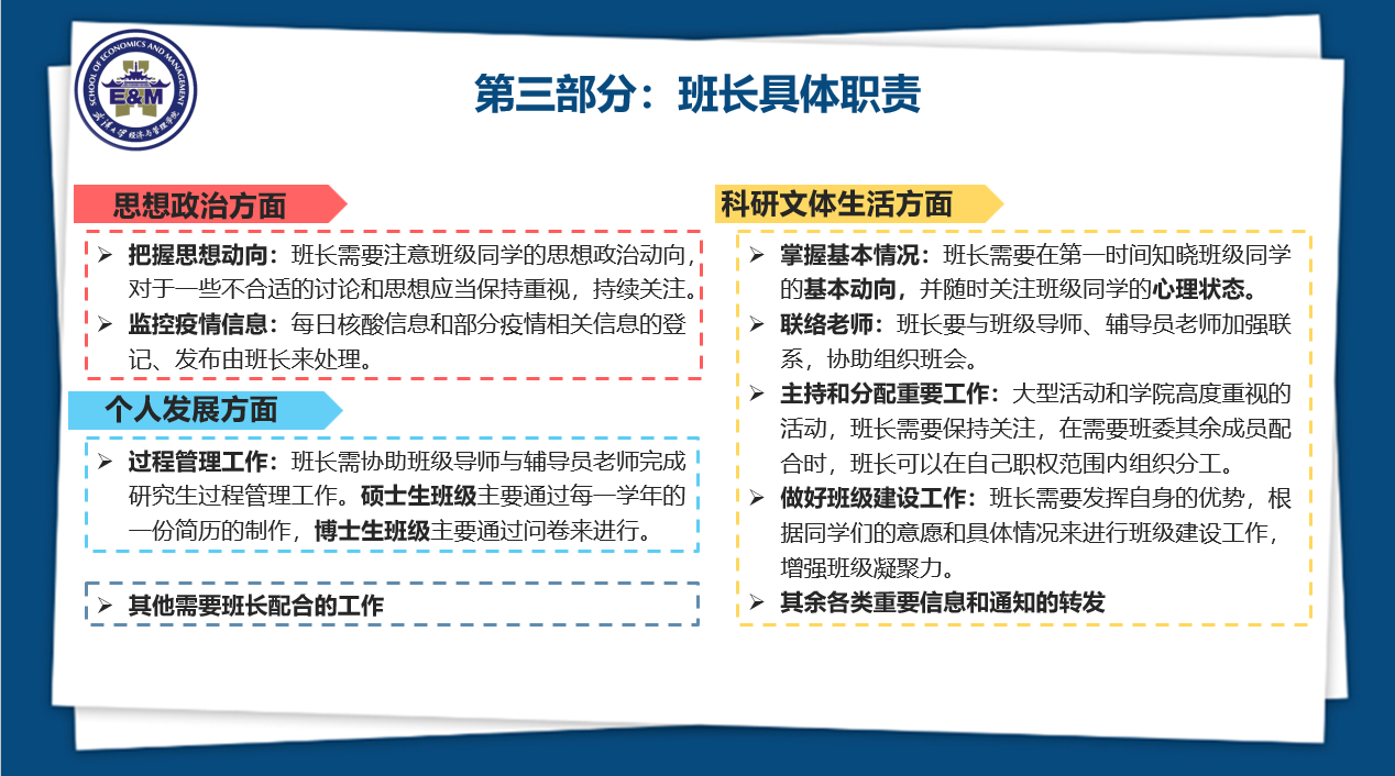 经过一系列的培训讲解之后,各班班长踊跃发言,交流自己的工作经验。2020级工商管理博士班班长宋毅宁同学分享了自己成为班长两个月以来的两点体会——上行下达、上行下效;2021级金融系硕士班班长马斌同学分享了担任班长一年半以来的三点感受,一是班委要有团队凝聚力,班长要及时了解其他班委遇到的问题,并及时反映同学的诉求,二是做工作要兼顾效率和质量,三是要做好班级内部建设,提高同学班级认同感;2022级世界经济系硕士班班长申至立同学提出:作为班长应该抓住“信息”两个字,及时关注学院的官网和公众号,把有用的信息传递分享。