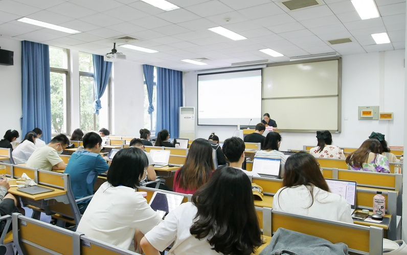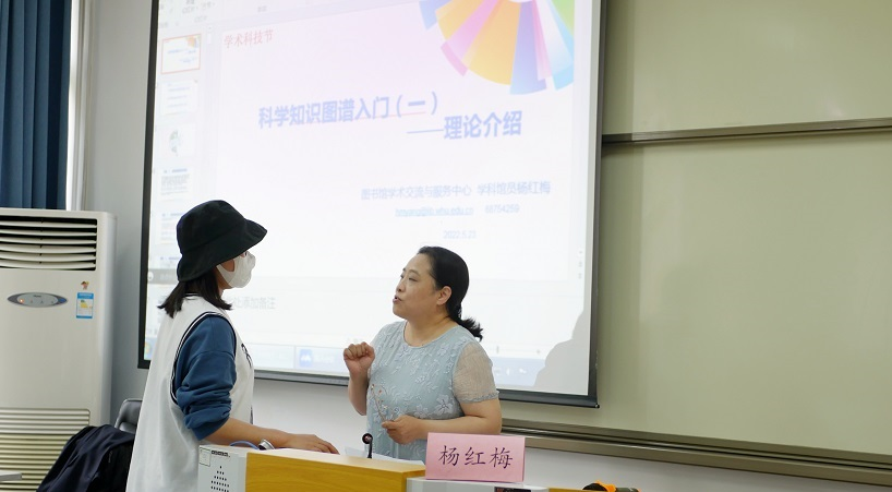 “知识图谱软件培训”系列讲座分上下两场进行,第一场于5月23日举行,主要阐述知识图谱相关理论知识;第二场于5月26日举行,讲授知识图谱软件的实际操作。为防控疫情风险,讲座设置了线上与线下双会场,在控制线下规模的同时,确保更多同学能够参与讲座培训。杨红梅老师围绕如何使用CiteSpace和VOSviewer两大制作知识图谱的常用软件,主要从认识科学图谱及其常用分析方法、CiteSpace和VOSviewer功能、安装及数据采集、参数及可视化界面以及实操案例等方面展开讲授。