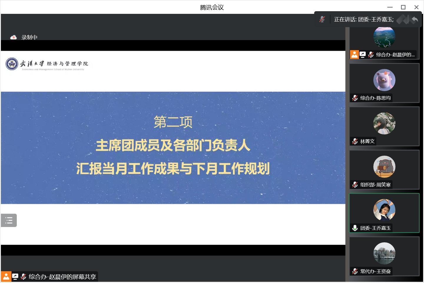 会议第三项,主席团成员就当前的重点工作进行布置和补充。学生团委副书记王乔嘉玉同学强调了团委组织部和团委融媒体中心的工作细节,主席团成员张一琪同学梳理了综合办公室和硕博学术部的下阶段工作安排,主席团成员洪文凤同学强调了2022年度经管团委研会工作大事记相关的信息收集整理工作,执行主席林菁文同学具体介绍了班委培训、班委述职评议方案和优秀研究生会评比相关的工作安排,王资奋同学带领大家学习了班长述职评议方案和班委述职评议方案,详细说明了方案的附件部分,并总结了工作要点。