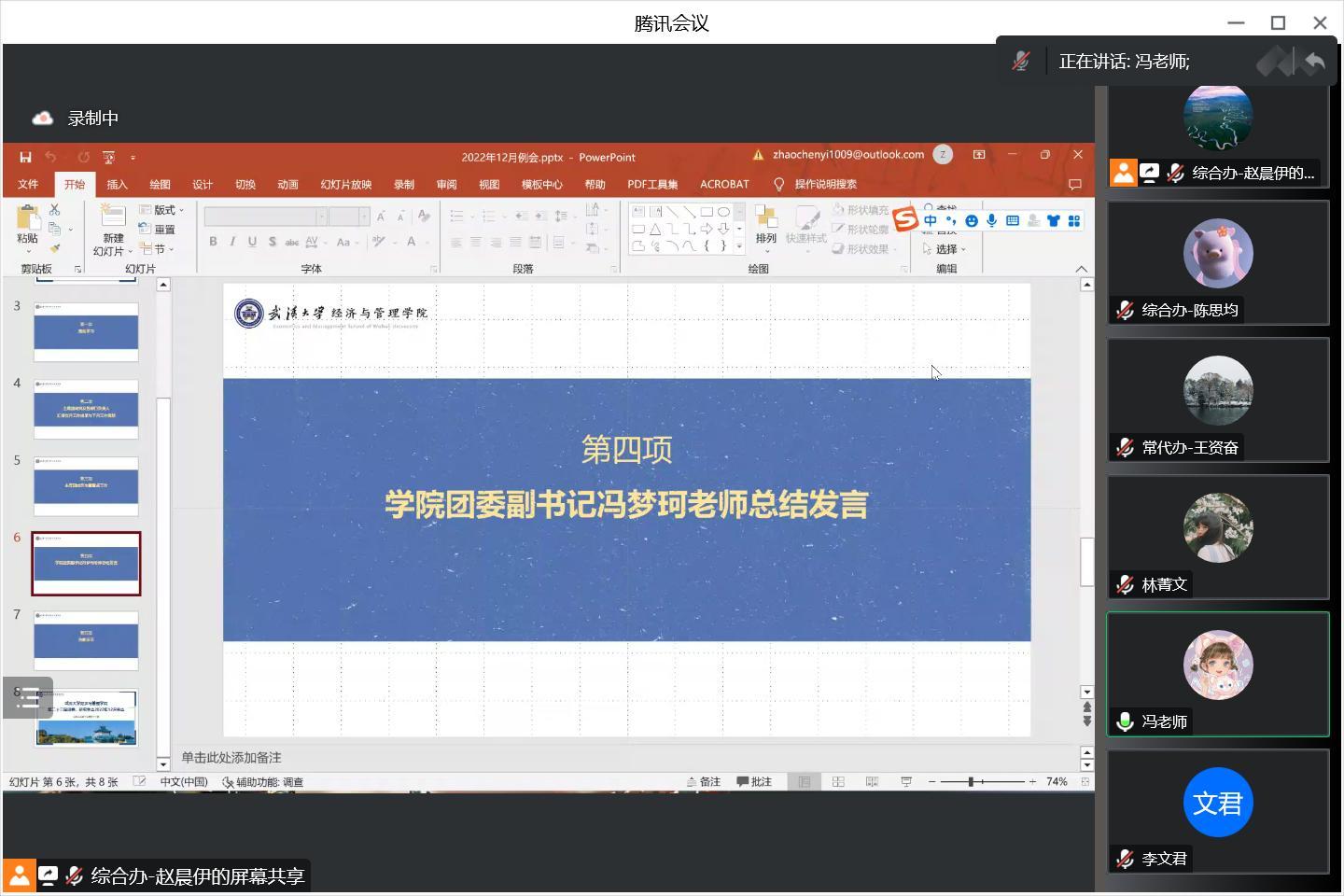 会议第四项,冯梦珂老师进行总结发言。冯老师表示,评比优秀研会对于每位同学自己的阶段性工作总结和研会集体的阶段性工作总结都是十分必要的,同学们要认真负责好自己的板块,有序开展工作。冯老师还强调了大家在面对困难时要锻炼起自己的韧性,要有克服困难的能力。同时,冯老师强调,身体是革命的本钱,同学们一定要增强体魄、提高免疫力。最后,冯老师带领大家学习了总书记2023年的新年致辞,希望寄予青年,同学们要厚植家国情怀、涵养进取品格,以奋斗姿态激扬青春,不负时代,不负华年。