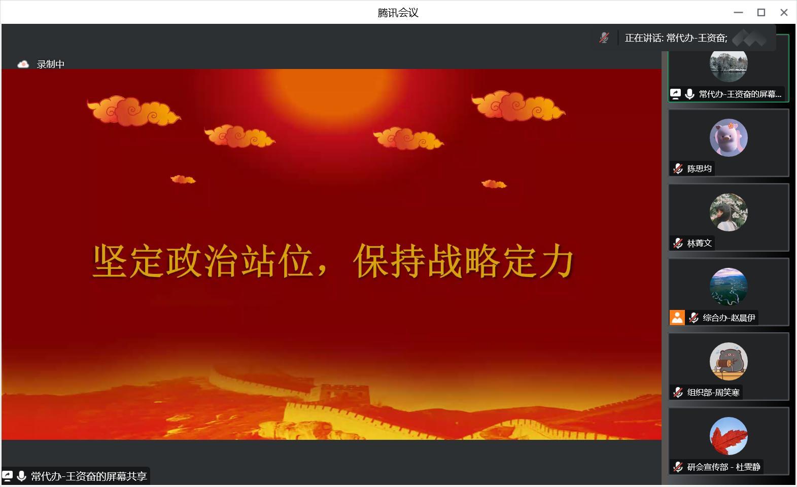 首先,常任代表委员会办公室负责人王资奋同学带领大家进行了主题为《坚持政治站位,保持战略定力》的理论学习,他提到青年学生要真正做到“千磨万击还坚劲,任尔东西南北风”,走好中国特色社会主义的必由之路。随后,学生团委副书记、研会主席团成员和各工作机构负责人汇报了十二月份的工作成果以及下一阶段工作计划,并沟通、对接了重要活动的相关事项。