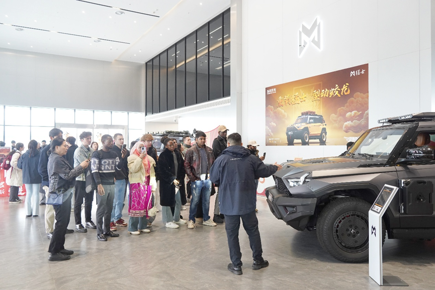 Director of the Human Resources Department at M-Hero Technology, Mr. Cheng MENG, guide the visit all in English. He introduced the founding background of M-Hero and explained how the brand draws inspiration from history, integrating Chinese cultural elements into the design philosophy of luxury off-road vehicles. M-Hero aims to provide customers with a unique driving experience and position itself as a pioneer in "luxury electric off-road culture." He demonstrated various M-Hero models, emphasizing their outstanding performance in different terrains, and elaborated the brand's global market positioning and target customer groups.