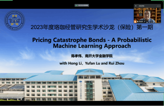 第一期学术沙龙于11月29日下午举办,主讲人为南开大学的陈孝伟教授。陈教授在学术沙龙中分享的论文提出了一种新的机器学习方法,为 CAT 债券价格生成概率预测,并在一级市场为巨灾债券定价。利用巨灾债券的数据,研究表明所提出的方法比传统的定价方法更稳健,对债券利差的预测更准确,能识别各种风险因素与债券利差之间的重要非线性关系,改善了定价模型。